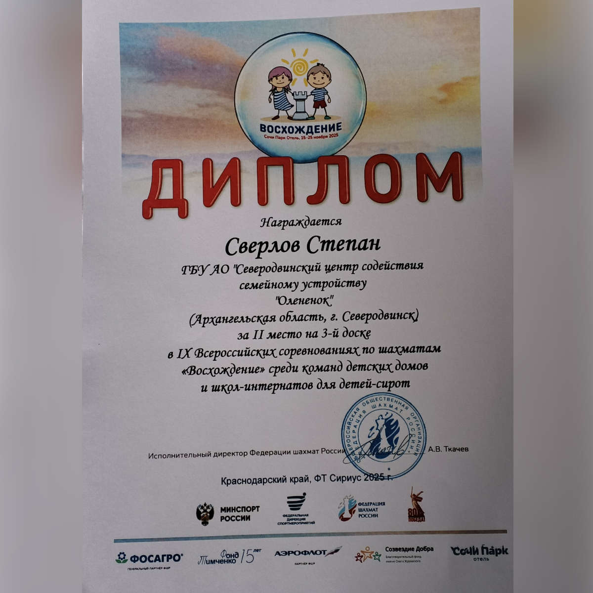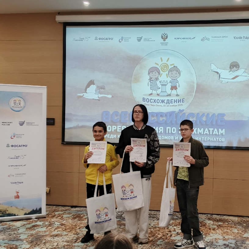 Фонд «Мои друзья» традиционно поддерживает обучение шахматам детей из Северодвинского центра содействия семейному устройству «Оленёнок» и их участие в турнирах. В этом году наша помощь позволила команде вновь отправиться на Всероссийские соревнования по шахматам «Восхождение» в Сочи, наш фонд оплатил проезд ребят и тренера в Сочи и обратно.